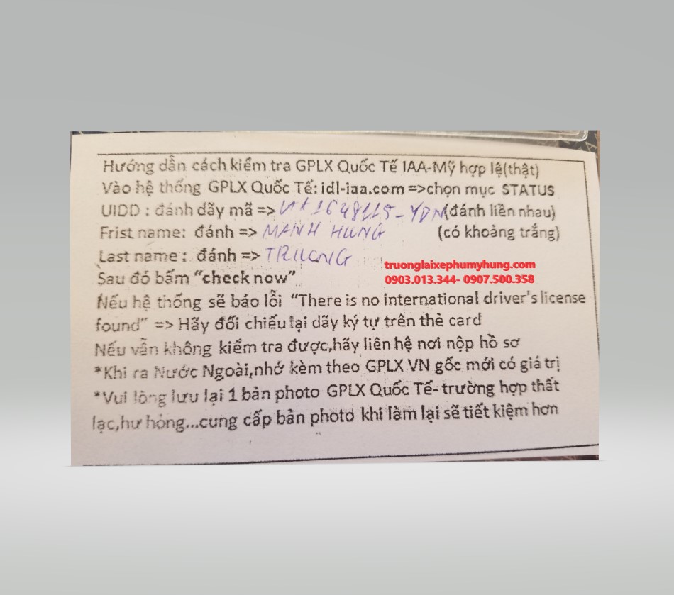 * Kiểm tra được bằng thật hay bằng giả trên hệ thống điện tử ( Giấy Phép Lái Xe Quốc Tế Việt Nam cấp không kiểm tra được thật giả )